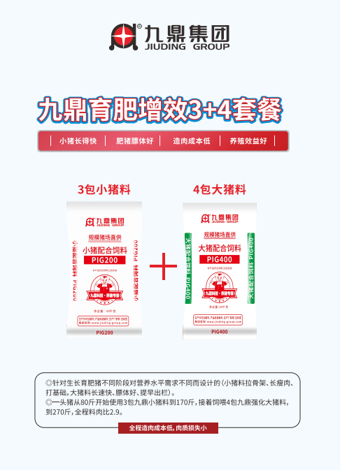 九鼎集團(tuán)專注豬料生產(chǎn)研發(fā)29年,致力于為廣大養(yǎng)殖企業(yè)提供優(yōu)質(zhì)高效的飼料產(chǎn)品,在全國擁有分子公司近30家,年銷售飼料200萬噸,此次展會(huì)推出了全新的套餐系列: