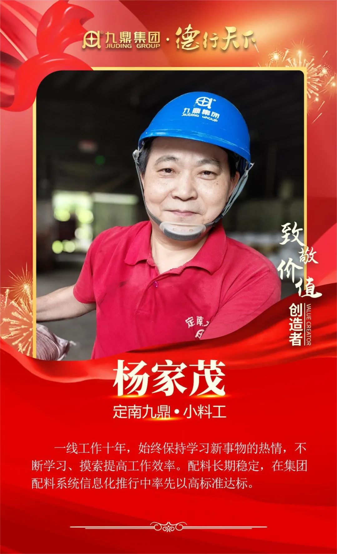用汗水澆灌收獲,以實(shí)干篤定前行。為大力弘揚(yáng)九鼎文化,鼓舞激勵廣大九鼎人學(xué)習(xí)標(biāo)桿、趕超先進(jìn),集團(tuán)總部組織開展了“致敬價值創(chuàng)造者”勞動模范評選。經(jīng)嚴(yán)格篩選考察,授予楊家茂等30名員工2023年度“勞動模范”稱號。