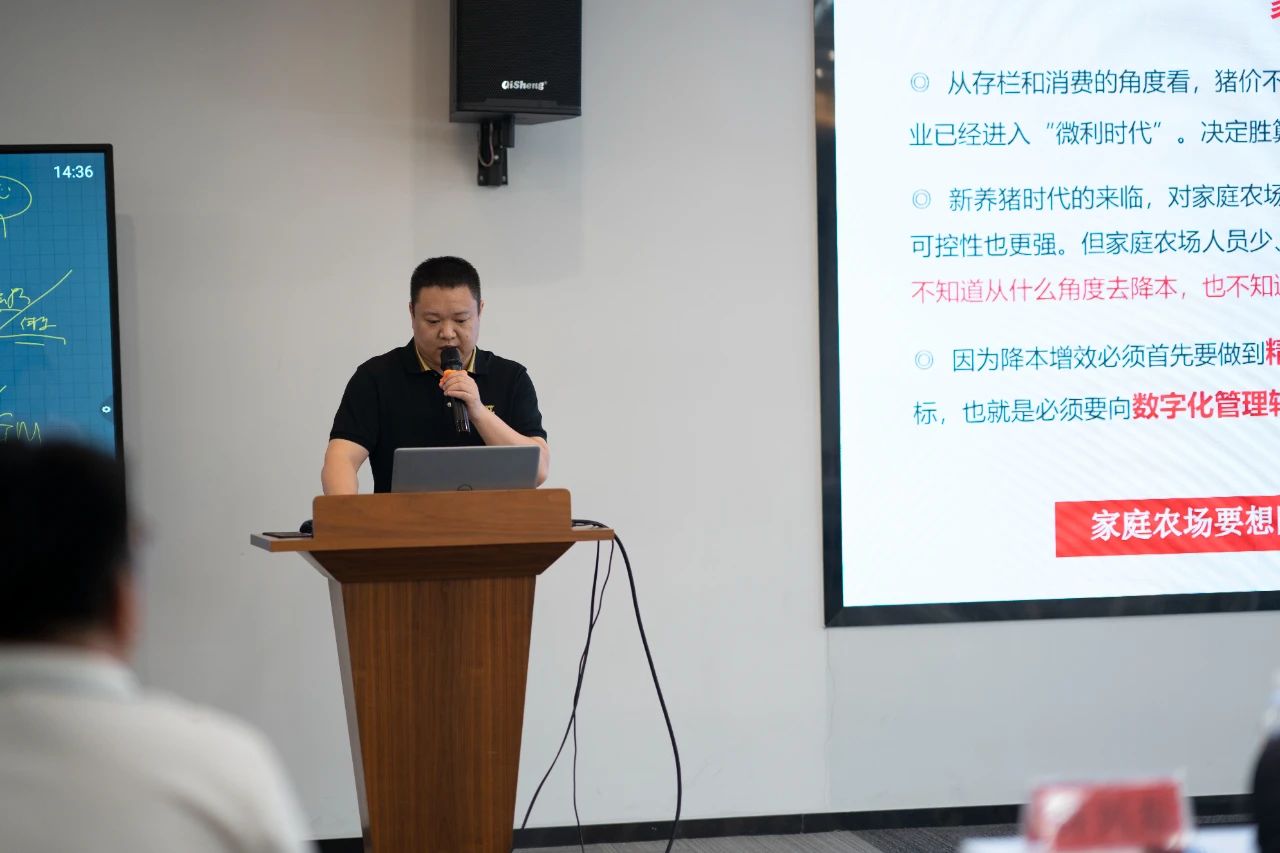 ▲集團研發(fā)中心總經(jīng)理江書忠介紹了《家庭農(nóng)場養(yǎng)豬E平臺》和《通過體況管理提升母豬生產(chǎn)成績》